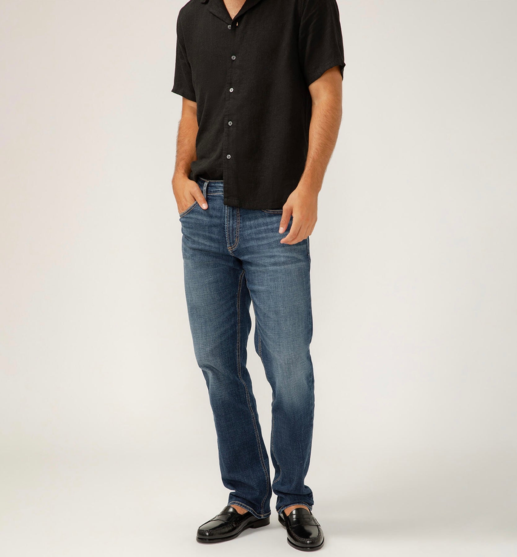 - Straight leg jeans in a medium-dark indigo wash