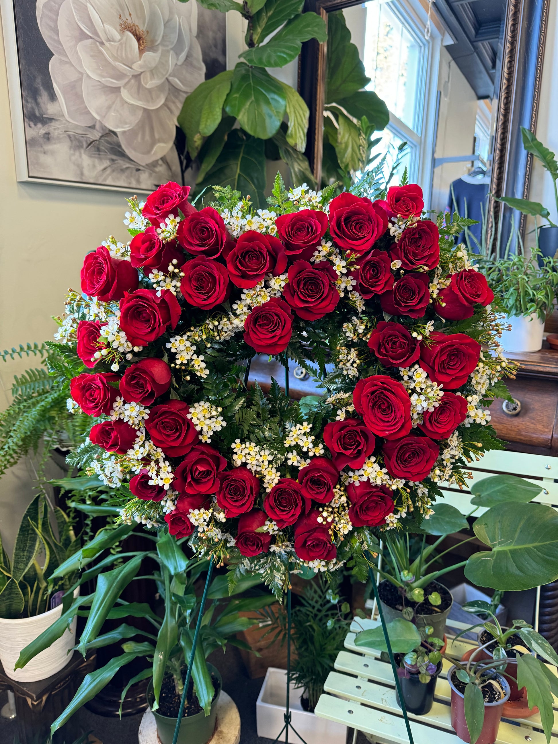 Discover the perfect way to express your love with our "Expression of Love" wreath. Featuring a gorgeous arrangement of red roses and delicate white wax (White wax is not always in season and may need to be substituted with babies breath) flowers in a heart-shaped open wreath, it's a beautiful symbol of your affection.
