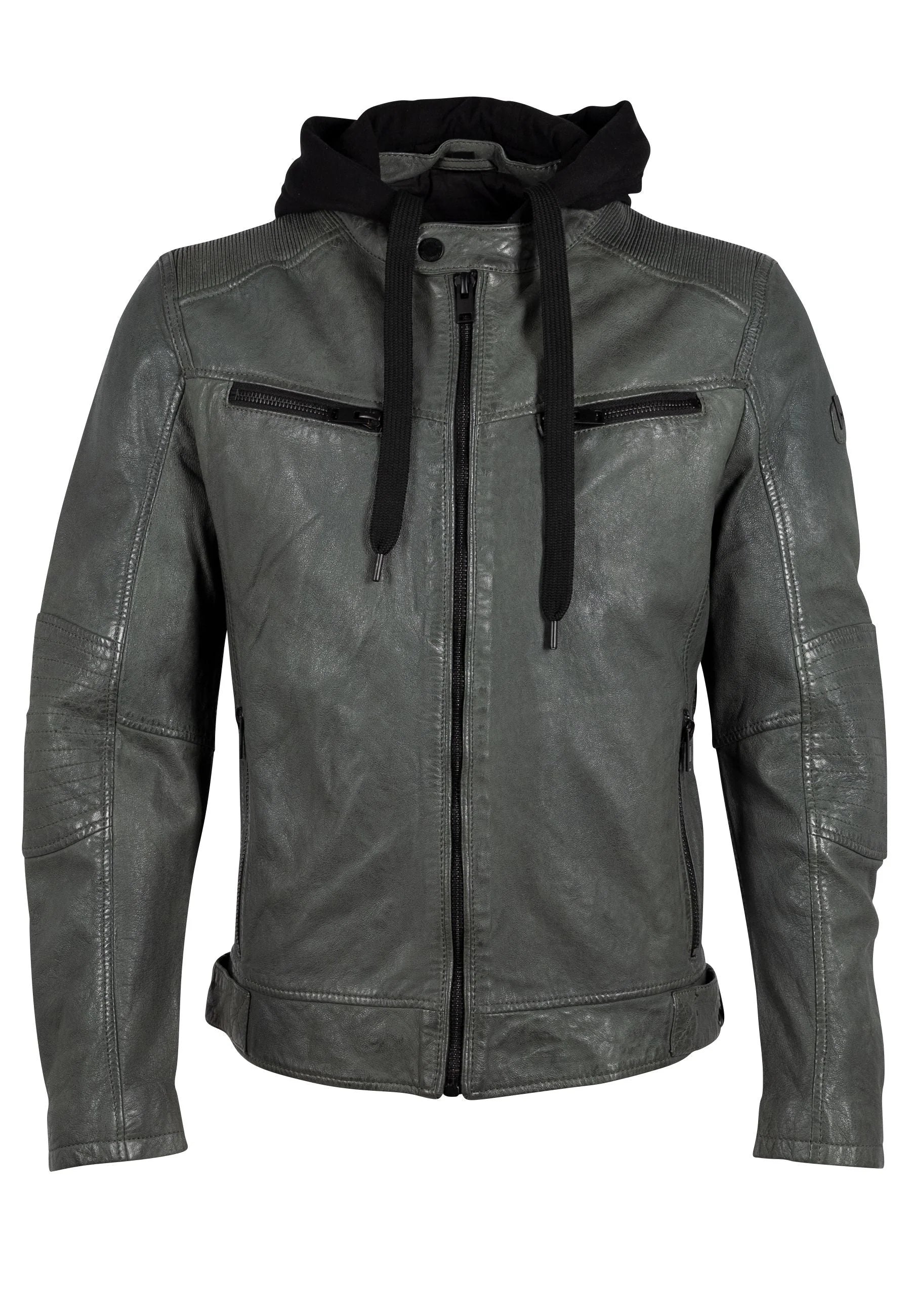Expert craftsmanship meets sleek style with the Kayto in Black. Distressed seams and embossed designs on elbows and shoulders add a touch of edginess, while the removable fleece hood offers versatility. Zipper details on the chest complete the look for a modern and functional leather jacket.