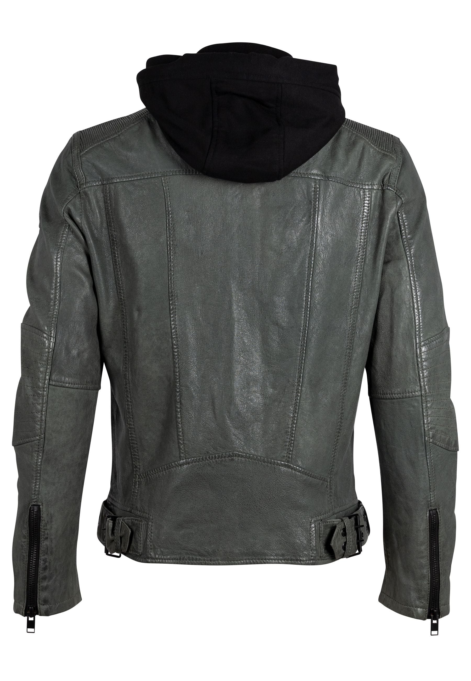 100% Vegetable tanned, lambskin leather jacket. Removable fleece hood.