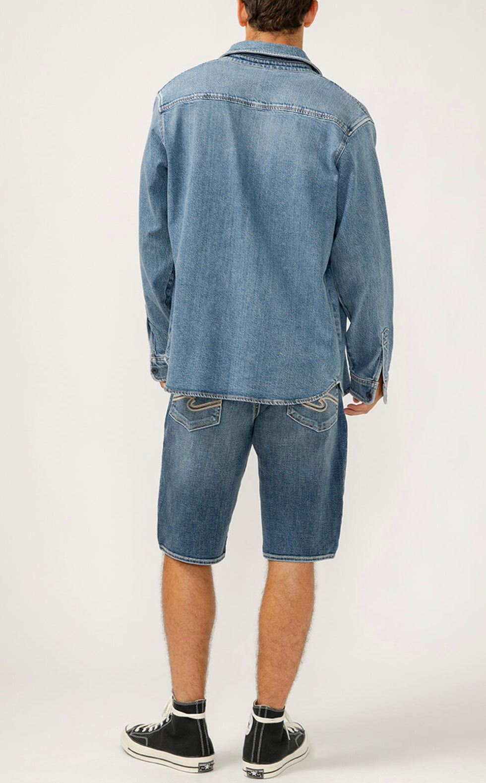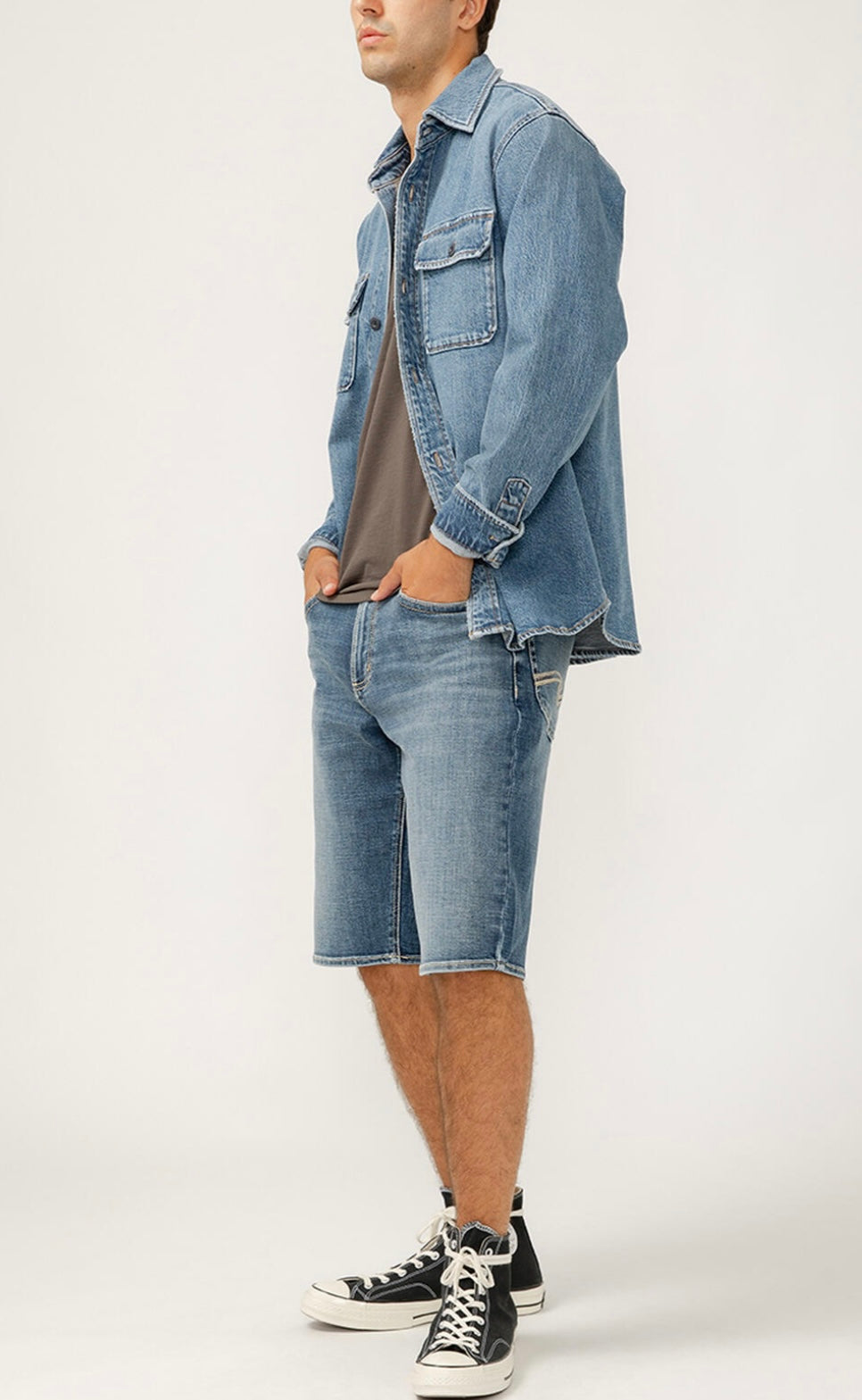 The perfect layer for any season? A men's denim shacket. This stylish top layer combines the structure of a jacket with the ease of a shirt, featuring a relaxed fit and oversized pockets. Wear it open or buttoned up, this jean shacket is sure to be your new staple layer.