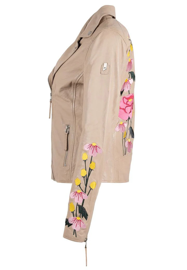 Our classic moto jacket with a beautiful floral twist! Peonie stuns with beige lambskin leather, and an embroidered pattern of flowers on the front, back and arms of the jacket.