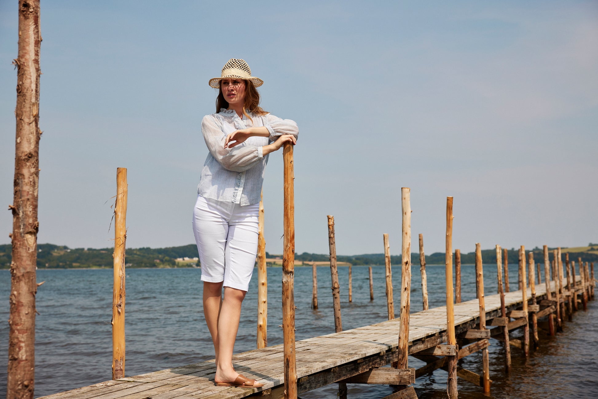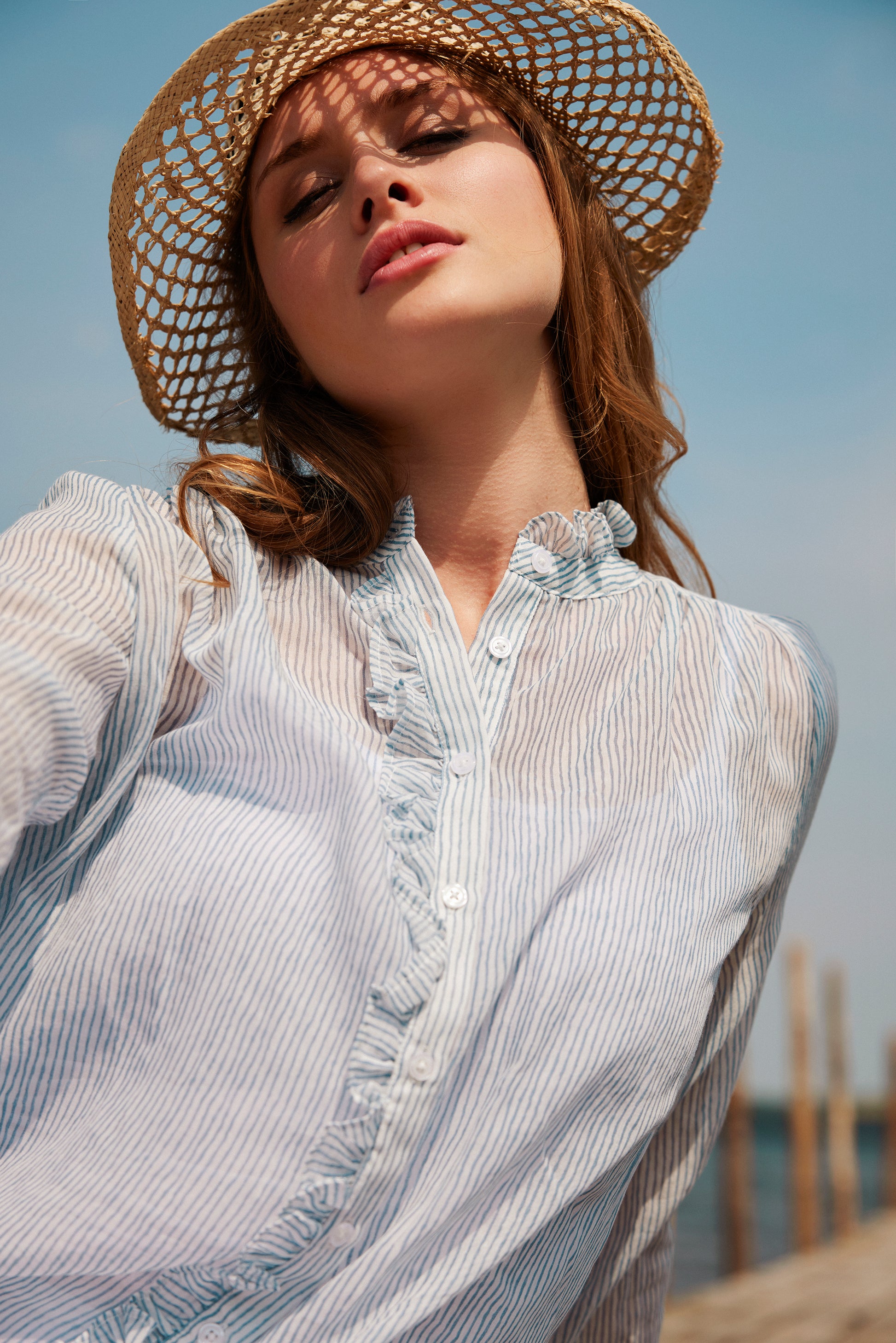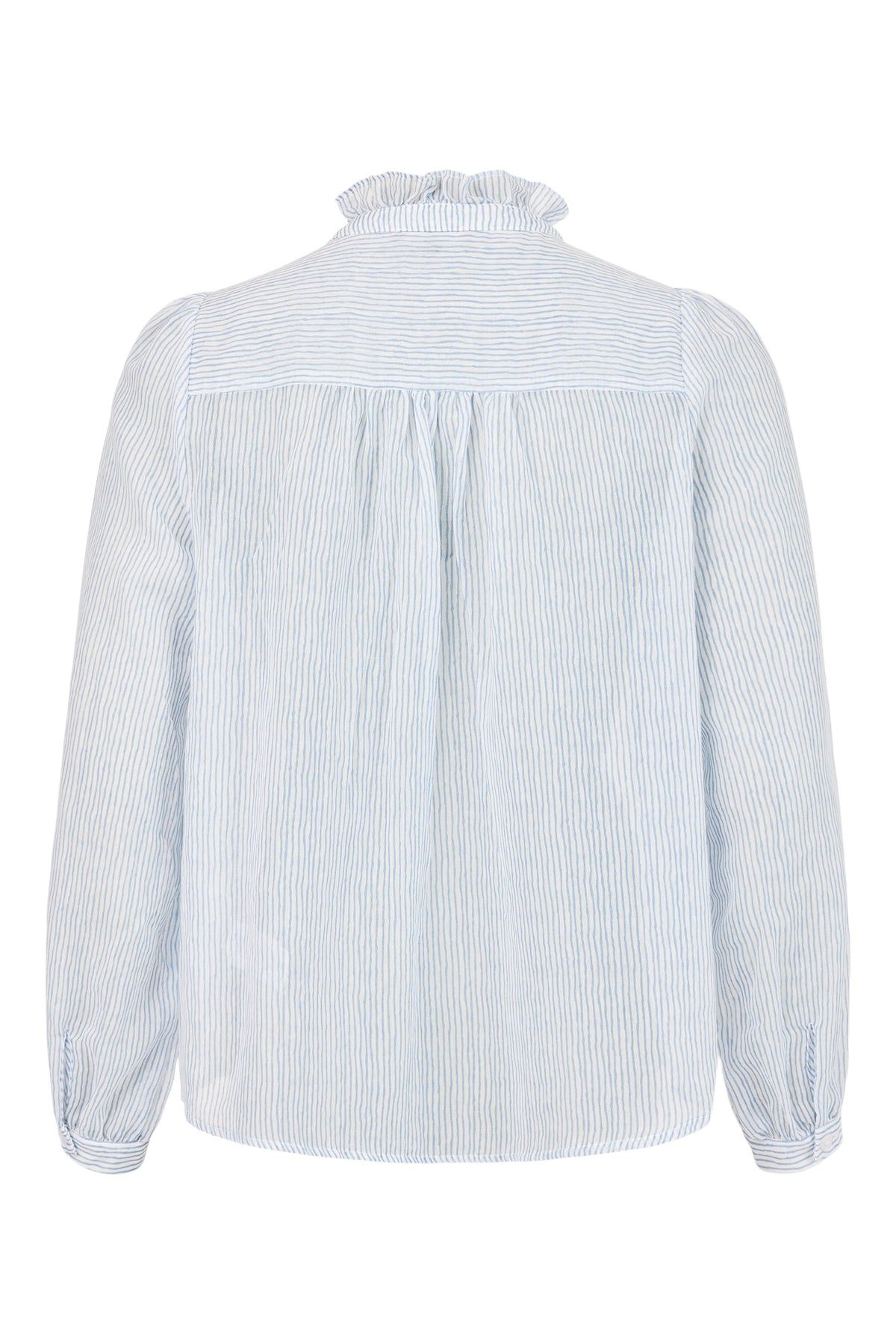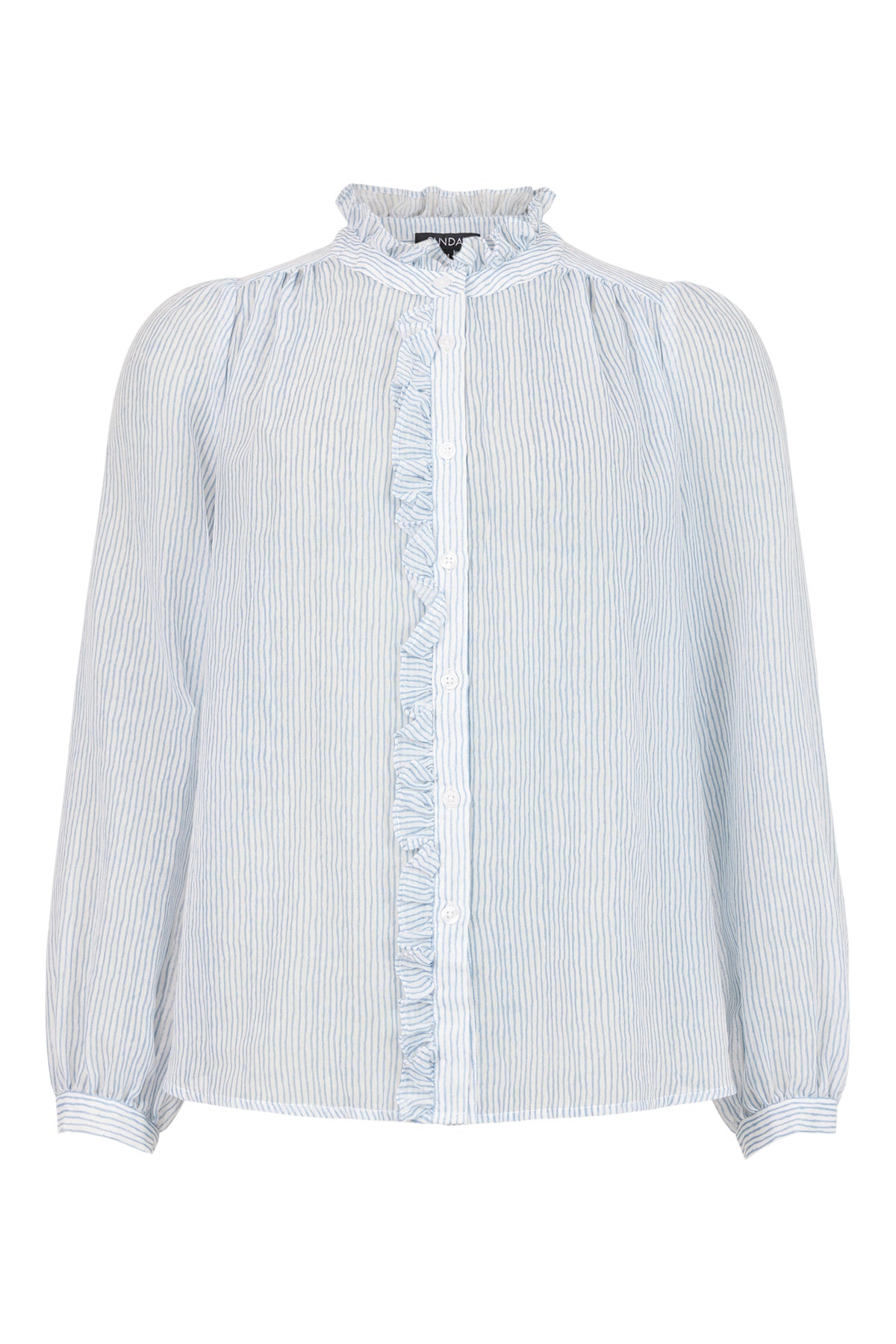 Experience effortless style with Top 6324 - SUNDAY. The expertly designed, 65% Polyester 35% Cotton top features a sophisticated white and light blue striped pattern and a charming ruffled collar. Perfect for any occasion, this top is the perfect addition to your wardrobe.