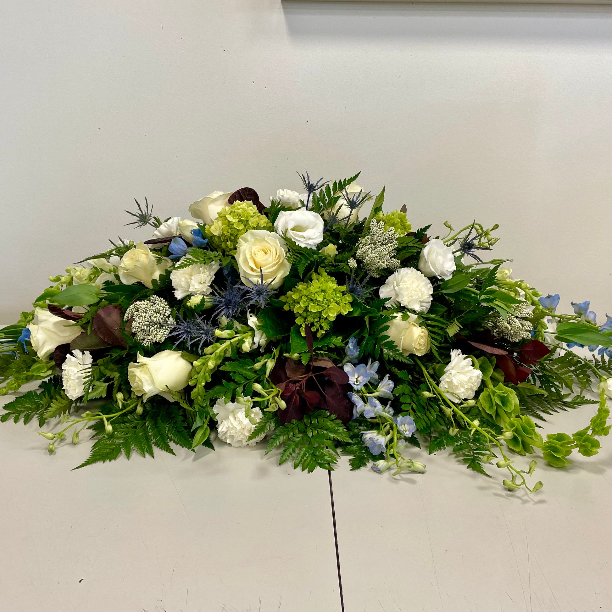 Expertly crafted with a garden style, Tranquil Embrace features delicate white flowers and dusty blue delphiniums. This floral funeral casket spray provides a serene and calming atmosphere, paying tribute to loved ones with a touch of natural beauty.