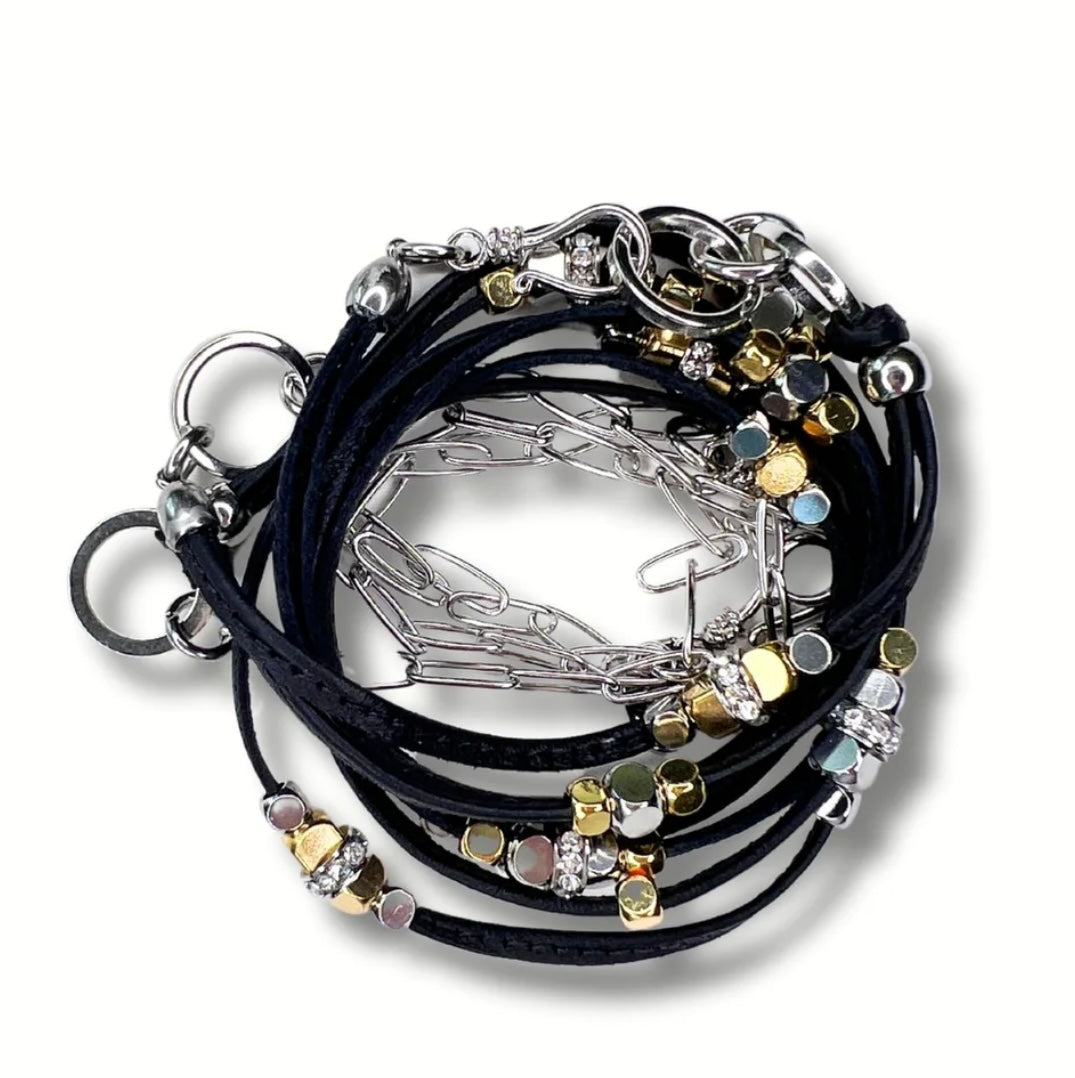 What sets the Udesign Double Shift apart is the fluidity of the leather that allows for effortless wrapping and the innovative feature that allows the beads to gracefully shift along the leather, enabling you to customize any look with ease. The result is an impressive variety of styles, each possessing an intriguing and unpredictable sophistication.