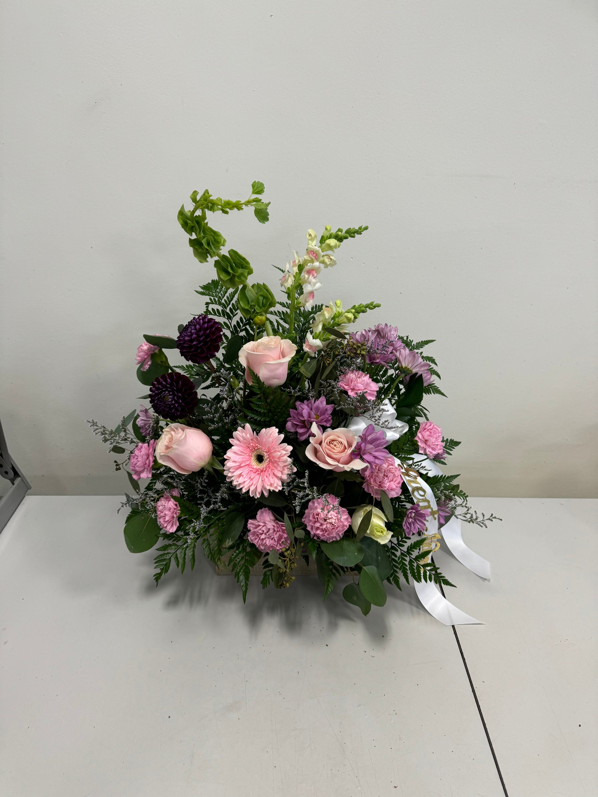 Honor the life of a loved one with our Warm Remembrance funeral arrangement. This elegant arrangement features white roses, soft yellow carnations, flat mums, and snap dragons in a wooden box. Pay tribute to their memory with this peaceful and comforting display.